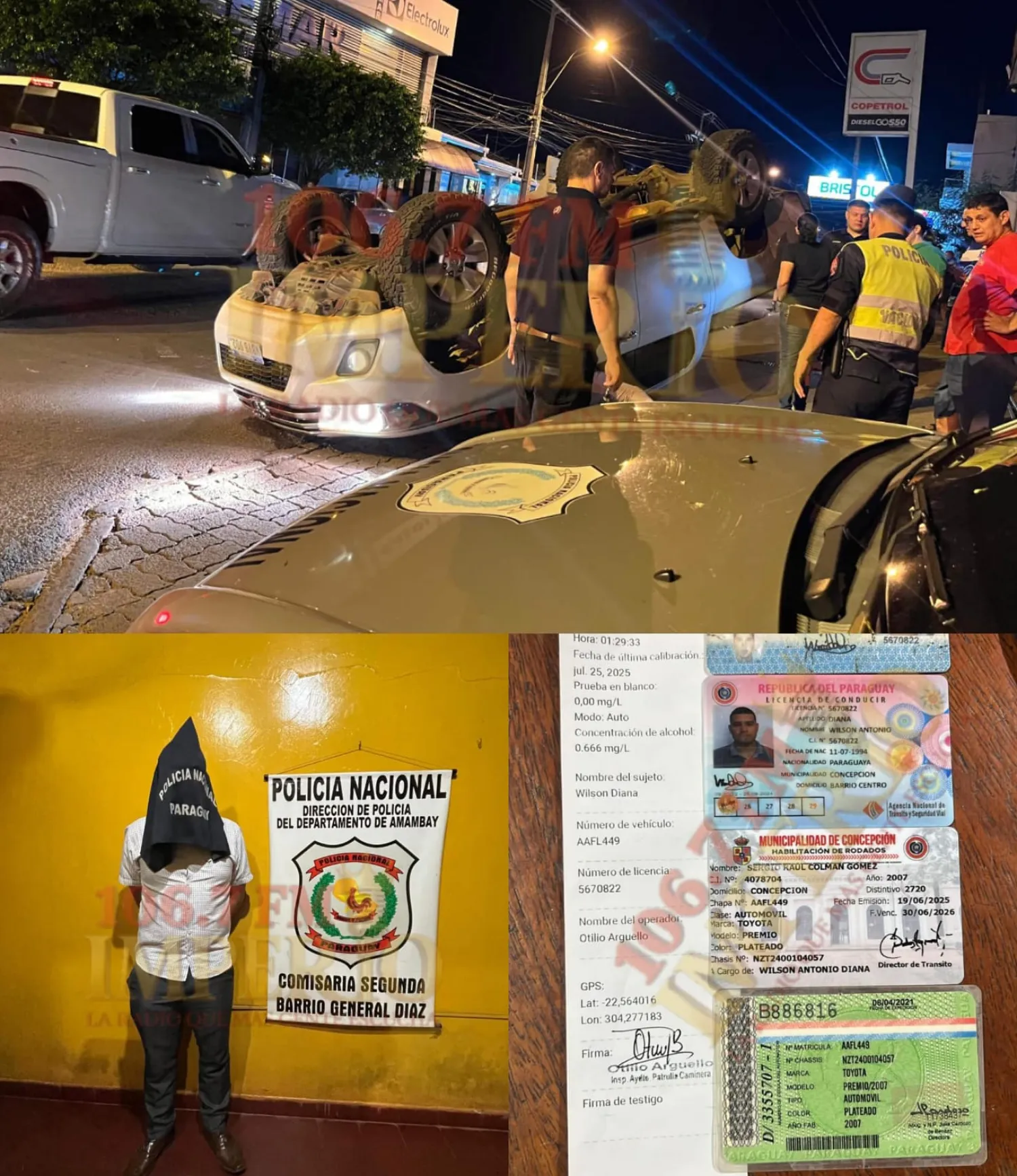 Tras el procedimiento, los conductores fueron sometidos a la prueba de alcotest. Wilson Antonio Diana arrojó resultado positivo de 0,666 mg/l de alcohol en sangre, mientras que Mauro Arnaldo Méreles Arteta dio resultado negativo de 0,000 mg/l.